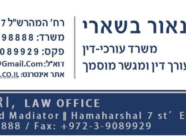 נאור בשארי, עורך הדין שלך ב ובמרכז. ניתן לקבל שרות בתחומים , . השירות ניתן באופן דיסקרטי ומקצועי. ניתן לקבל שרותים בנושא , , , או כל נושא אחר. ניתן ליצור איתנו קשר בטלפון או להגיע למשרד הממוקם במהרש"ל 7, . בנוסף, משרדנו מתמחה בטיפול ב, , ו.